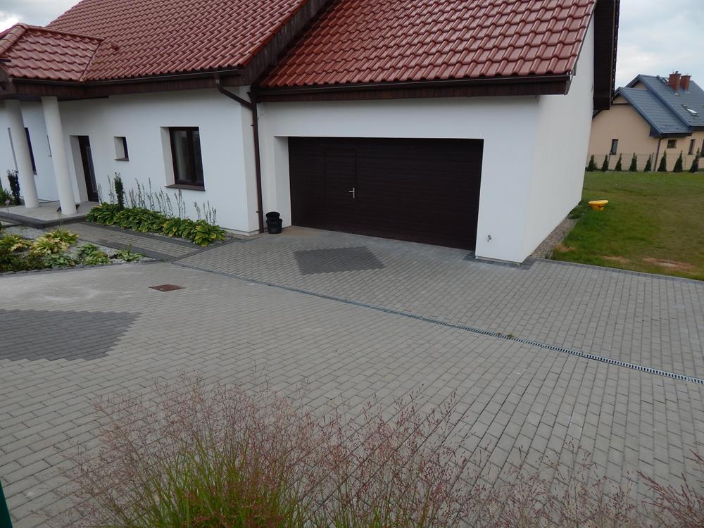 Kompleksowe zagospodarowanie terenu wokół domu. Wykonano estetyczne i funkcjonalne nawierzchnie utwardzone z kostki brukowej – ścieżki, podjazd, taras. Dzięki starannemu zaprojektowaniu i wykonaniu będą trwałe i odporne na obciążenia.