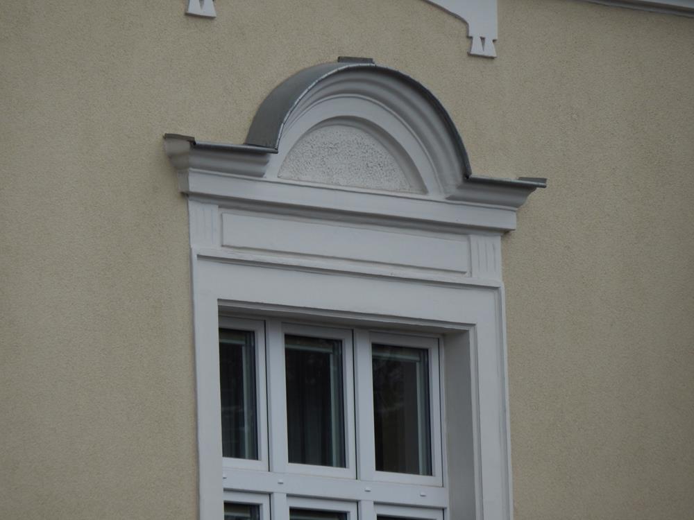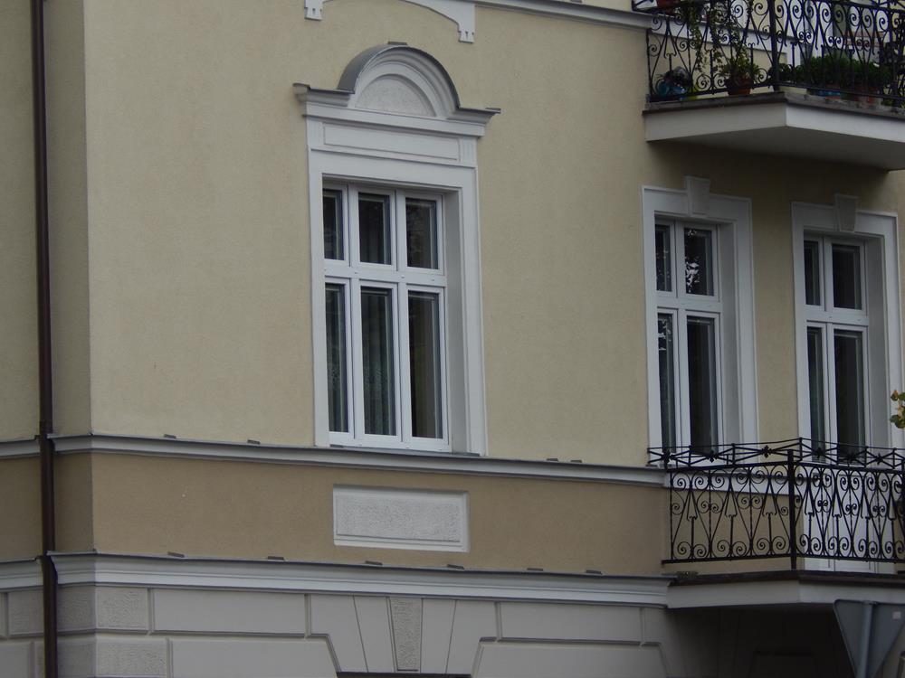 Renowację detali architektonicznych metodą tradycyjną z użyciem drobnoziarnistych zapraw sztukatorskich, tzw. zapraw ciągnionych. Dzięki temu z dużą precyzją odtworzono profile ciągnione oraz inne zdobienia, przywracając im pierwotny charakter.