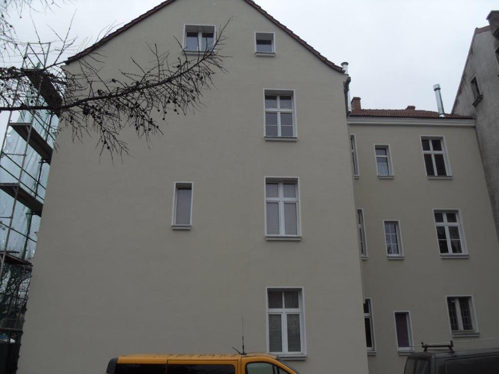 Renowację elewacji z wykorzystaniem specjalistycznych zapraw renowacyjnych. Istniejące tynki oczyszczono, ubytki uzupełniono, a powierzchnię wyrównano, przywracając elewacji estetyczny wygląd. Zaprawy renowacyjne dobrano odpowiednio do stanu i rodzaju podłoża.