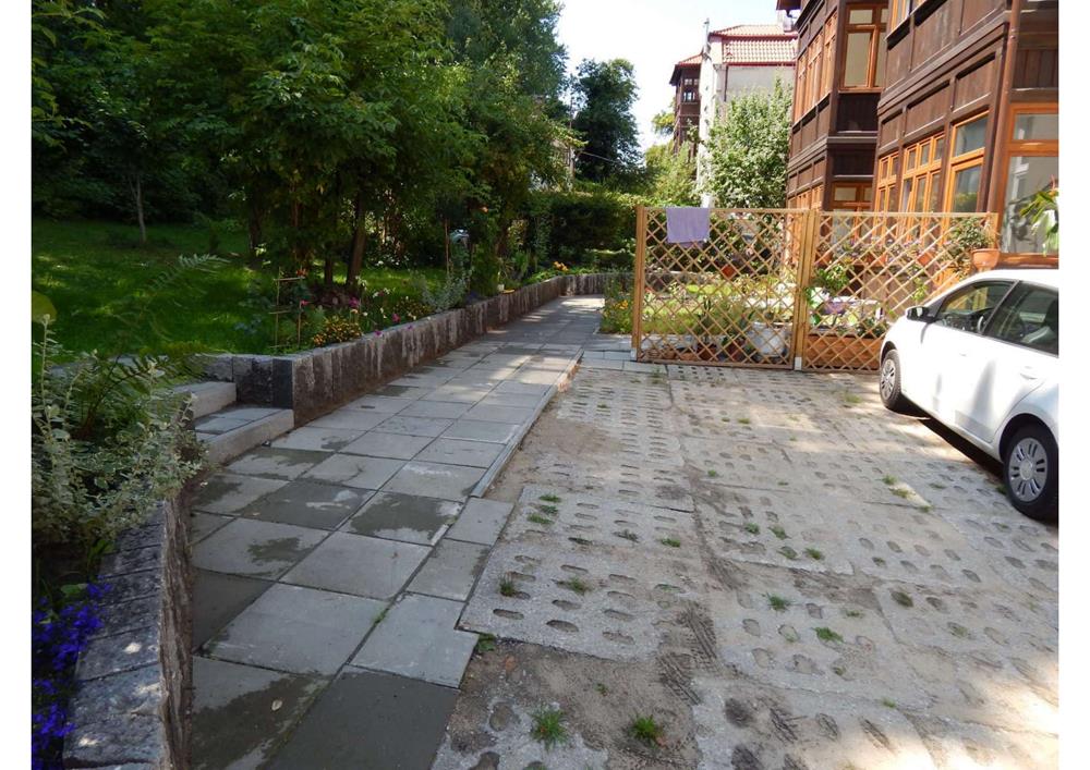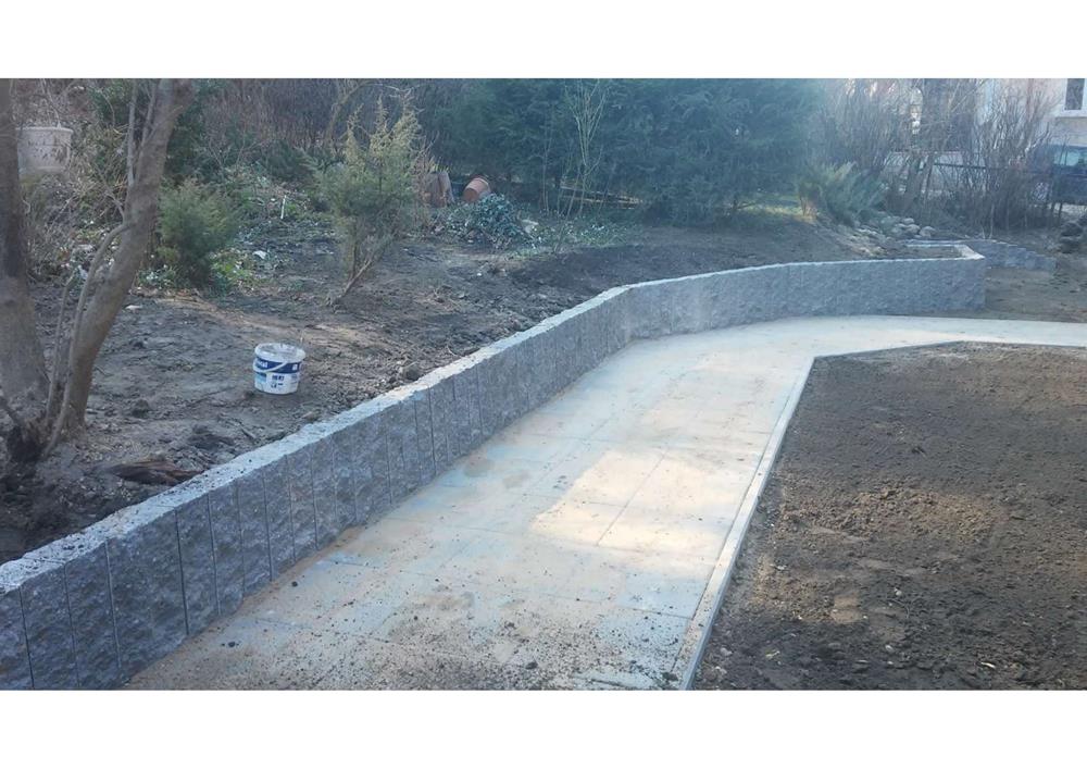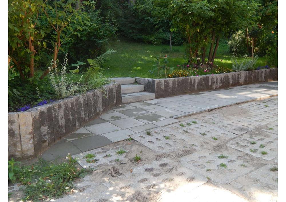 Zagospodarowanie terenu wokół budynku. Od strony podwórka wykonano nowe ścieżki i murki oporowe z kostki brukowej. Od frontu przełożono chodnik, poprawiając bezpieczeństwo i estetykę wejścia do budynku. Prace przeprowadzono zgodnie z projektem zagospodarowania terenu.