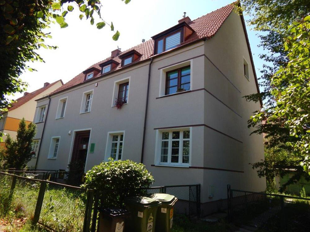 Ocieplenie elewacji budynku. Zastosowano wysokiej jakości system ociepleń, składający się z płyt styropianowych, zaprawy klejącej, siatki zbrojącej, tynku oraz farby elewacyjnej. Dzięki temu znacząco poprawiono parametry termoizolacyjne budynku, co przełoży się na niższe koszty ogrzewania i większy komfort mieszkańców.